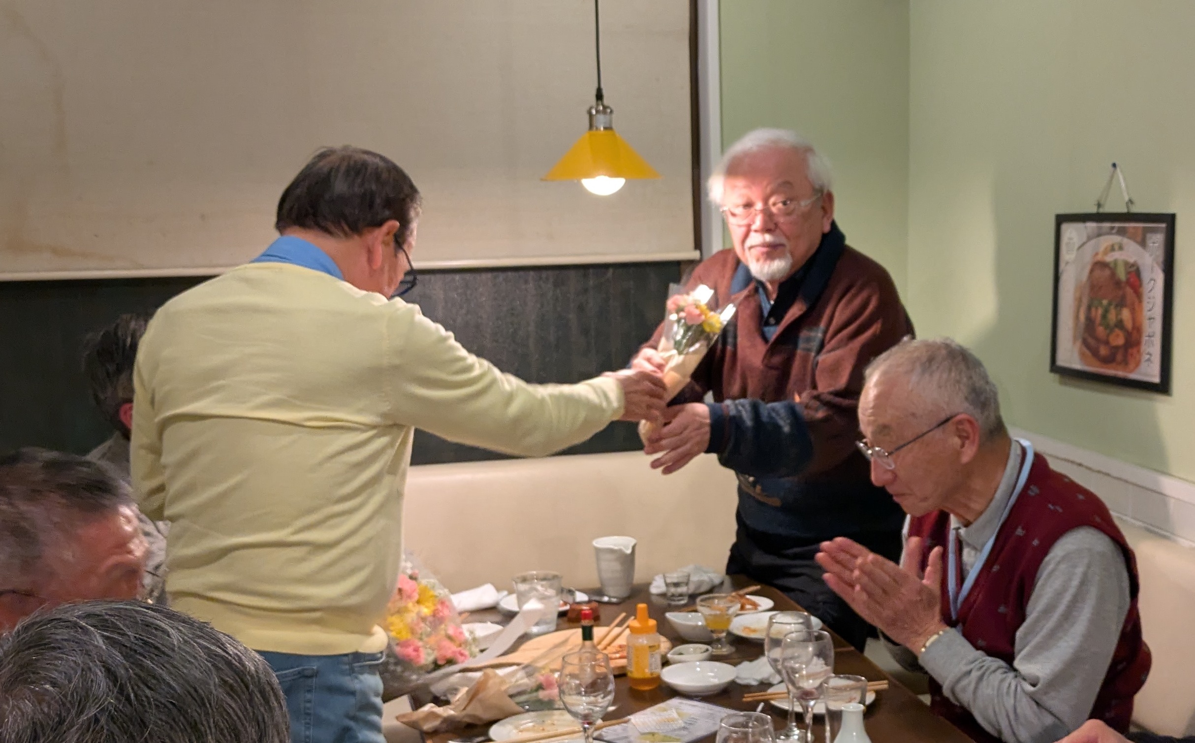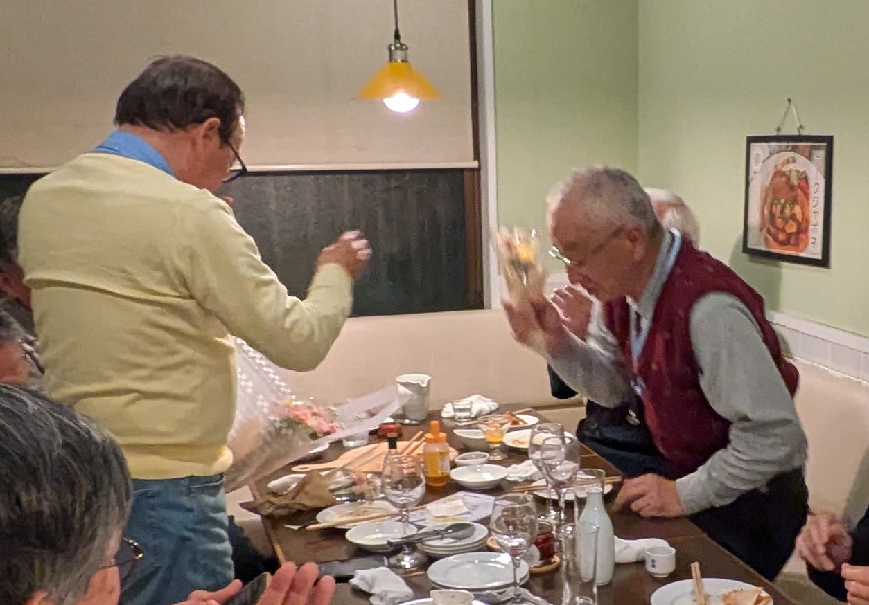 | 2025年11月15日 第21回誕生会 第21回誕生会が開催されました。 出席者は男性のみ8名、うち今回の誕生月(8月から11月)対象の方は岡崎さんお一人でした。 開催場所は久しぶりに利用させていただく「日本料理ひら川」です。 東村山駅西口すぐ前という場所も便利で、料理もおいしいお店です。 18時に開始、20時過ぎまでおいしいお酒と料理で話が弾み、楽しく過ごすことができました。 まずは生ビールで乾杯、その後は後は自由に飲み放題です。 今回は、櫻井さんからの差し入れで「本格焼酎 百年の孤独」があり、ロック、水割りと好みに合わせていただきました。 飲み放題に持ち込みはもったいないのですが、おいしい焼酎でそこは気にせず、満足です。 「百年の孤独」はすぐになくなり、後は自由に飲み放題です。 最後に岡崎さんに花束をお渡しして誕生会を終了しました。 今回は誕生月の方1名だけの参加で少し寂しい誕生会でした。 次回以降、多くの方に参加いただけるともっと楽しい誕生会になると思います。 お待ちしています。 (田中 記) |