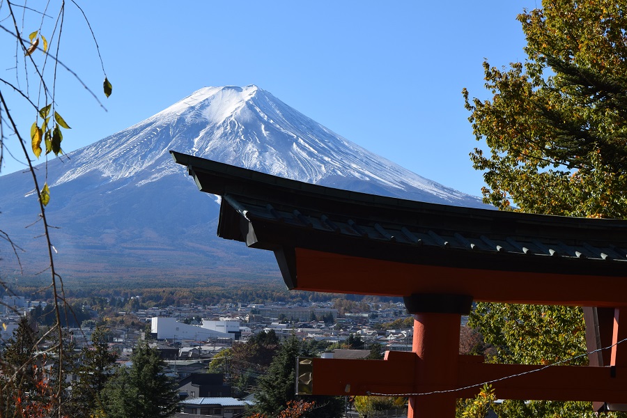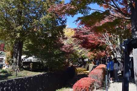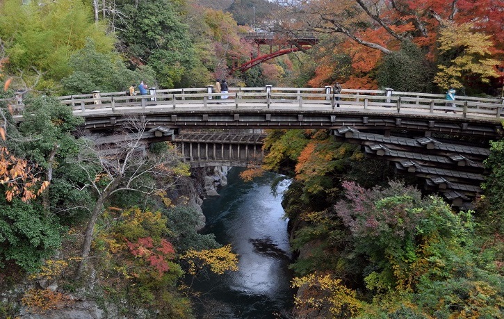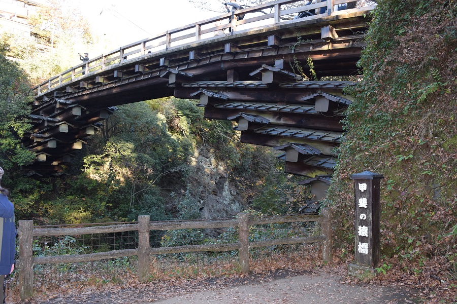 | 2023年11月14日 山梨の紅葉を巡るバスツアー 2023年11月14日、「クラブツーリズム」主催のバスツアーに参加しました。 当三田会からの参加者は9名です。ツアー全体では80名ほどの参加者で、朝の集合時には参加者の多さに驚いたほどでバス2台でのツアーでした。 東村山駅を7時10分に出発し、新倉山浅間公園、河口湖紅葉回廊、猿橋をめぐり、18時に東村山駅到着という行程です。当日の朝は大変寒くバスの暖房がありがたく感じましたが、天気は見事なまでの快晴で、昼間は動くと暑く感じられるほどでした。 最初の訪問地は「新倉山浅間公園」で、富士山と五重塔と紅葉が人気の場所です。あいにく、紅葉は今年の天候から色づきが悪かったのですが、快晴の中での富士山と五重塔(忠霊塔)の景色は見事でした。展望場所までは398段の石段を登らなければならず、脚力の弱さを痛感しながらもなんとか上まで登ることができました。ただ、参加者の内、紿田さん、熊谷さんは自重して下で待機です。 春、桜の季節は素晴らしいだろうなと再訪したいと感じました。 次いで、「河口湖紅葉回廊」を訪れました。やはり紅葉は物足りなかったですが、河口湖からの富士山の眺めは雄大で、快晴の中で絶景を楽しみました。 昼食は「信玄館(しんげんやかた)」で山梨名物のほうとうと松茸炊き込みおこわをいただきました。「信玄館」というだけあって、玄関前の信玄像は甲府駅前の像と同じデザインのようで迫力満点です。また、今回のコースには入っていませんが、「信玄館」の目の前が「恵林寺」です。「恵林寺」は信玄の墓所であり、快川国師の「心頭滅却すれば火も自ら涼し」でも知られている古刹です。食事の後、短い時間でしたが境内を訪れてきました。 最後は「猿橋」を訪れました。伝承では600年代推古朝の時代に初めて橋が架けられたとされています。現在の橋は昭和59年に架けられたもので、江戸時代の資料を基に復元されたとのことです。橋の上は普通なのですが、下から見ると、深い谷間のために橋脚はなく、鋭くそびえたつ両岸から四層に重ねられた「刎木(はねぎ)」とよばれる支え木をせり出て橋を支える構造が見られます。徳島県のかずら橋、山口県の錦帯橋などと「日本3奇橋」に数えられています。そばに昔の水力発電所の施設であった水路橋が通っていて、珍しいので写真を撮っておきました。 これで全ての旅程を終え帰路につきました。途中、若干の渋滞がありましたが、18時30分、無事に東村山駅に到着です。天候に恵まれ、参加者全員このバスツアーを楽しむことができました。 (田中 記) |