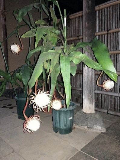 つぼみは初期には垂れ下がっていますが、開花が近くなると自然に上を向いて膨らみ、夕方に芳香を漂わせはじめ、夜になると開花、翌朝には、萎んでしまいます。