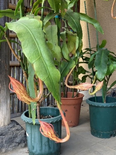 月下美人はメキシコの熱帯雨林地帯を原産地とする、 幅広い肉厚な葉がうねるように伸びるサボテン科の 常緑多肉植物で、日本で栽培されているものは、